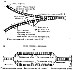 В настоящее время установлено, что синтез второй цепи ДНК осуществляется короткими фрагментами (фрагменты Оказаки) также в направлении от 5' - к 3'-концу (по типу шитья "назад иголкой"). У прокариот фрагменты Оказаки содержат от 1000 до 2000 нуклеотидов, у эукариот они значительно короче (от 100 до 200 нуклеотидов). Синтезу каждого такого фрагмента предшествует образование РНК-затравки длиной около 10 нуклеотидов. Вновь образованный фрагмент с помощью фермента ДНК-лигазы соединяется с предшествующим фрагментом после удаления его РНК-затравки (рис.12, А).