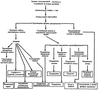 Рис.21. Плейотропный эффект замены одной аминокислоты в β-цепи гемоглобина человека, приводящей к развитию серповидно-клеточной анемии