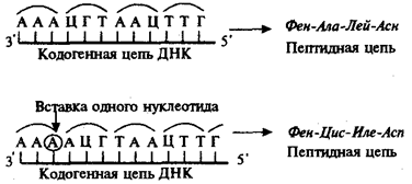 Сдвиг рамки считывания в результате вставки одного нуклеотида в кодогенную цепь приводит к изменению состава зашифрованного в ней пептида