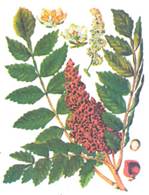 Описание растения. Сумах дубильный — кустарник или небольшое маловетвистое деревце семейства сумахо-вых, высотой от 1 до 3 м. Кора деревьев и взрослых кустов коричневатая, рыхлопушистая. На однолетних побегах кора буроватая, шершавопушистая, на многолетних стволах и ветвях темно-бурая. Листья очередные, непарноперистые, с 4—8 парами сидячих супротивных листочков, шершавопушистые, сверху темно-зеленые, снизу почти серые, длиной 15—20 см, шириной 1,5—3 см, продолговатотяйцевидные, с широким, клиновидным основанием и, заостренной верхушкой, по краям крупнобородчато-пильчатые.