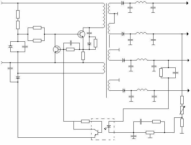 Следует отметить, что несмотря на простоту описания схемы, ремонт такого ИП иногда бывает затруднен отсутствием оригинального ключевого транзистора. Попытки применить вместо него транзистор для блоков строчной развертки не всегда приводят к желаемому результату из-за, как правило, низкого коэффициента передачи тока у последних, при этом либо происходит не надежный запуск ИП или он вообще не запускается.