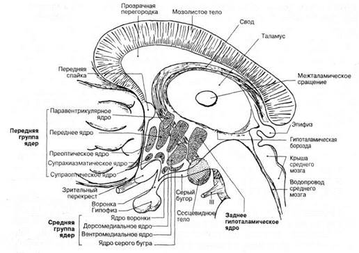 К средней группе гипоталамических ядер относят дорсомедиальное и вент-ромедиальное ядра, ядро серого бугра и ядро воронки.