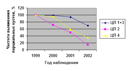 Следовательно, парциальные кусты брусники во всех изученных ценопопуляциях развиваются преимущественно по пути с пропусками возрастных состояний, и лишь для незначительной доли их характерно последовательное онтогенетическое развитие без пропусков отдельных этапов онтогенеза, причём это утверждение справедливо для всех возрастных групп.