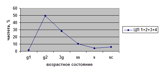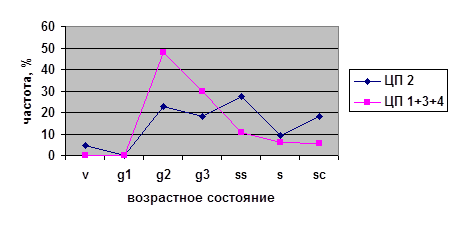 В исследованных ценопопуляциях проводилось изучение возрастных спектров последнего года исследований (2002) для парциальных кустов разных возрастных состояний на старте (рис. 4). Полученные данные были проанализированы с помощью критерия хи-квадрат (χ²). Виргинильные, молодые генеративные и средневозрастные генеративные парциальные кусты из разных ценопопуляций на четвёртый год наблюдений дают разные возрастные спектры. При этом не наблюдается статистически значимых различий между ЦП 1, 3 и 4 в случае виргинильных парциальных кустов; между ЦП 2, 3 и 4 в случае молодых генеративных парциальных кустов и между ЦП 1, 2 и 4 в случае средневозрастных генеративных парциальных кустов. Возрастные спектры имматурных и старых генеративных ПК из разных ценопопуляций не различаются.