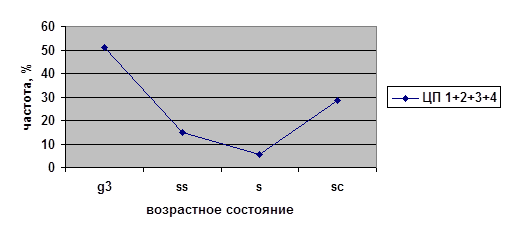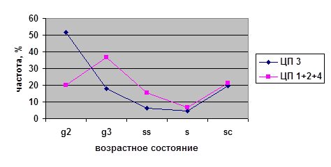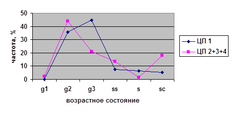 3. Парциальные кусты брусники всех изученных ценопопуляций имеют различный ход онтогенеза. Наиболее часто встречается ход с пропусками одного или нескольких возрастных состояний. Частоты таких парциальных кустов составляют 52-86%.
