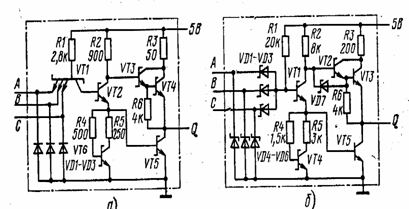 На основе транзисторов Шотки в начале 70-х годов были выпущены первые микросхемы двух основных современных серий ТТЛ. На рисунке 7, а показана схема высокоскоростного логического элемента, применяемого как
