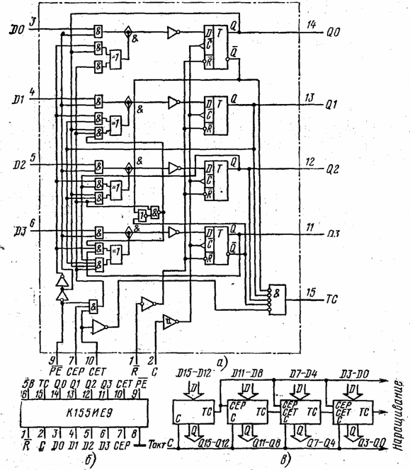 На рисунке 8, в показана схема соединения четырех микросхем ИЕ9 в быстрый синхронный 16-разрядный счетчик.
