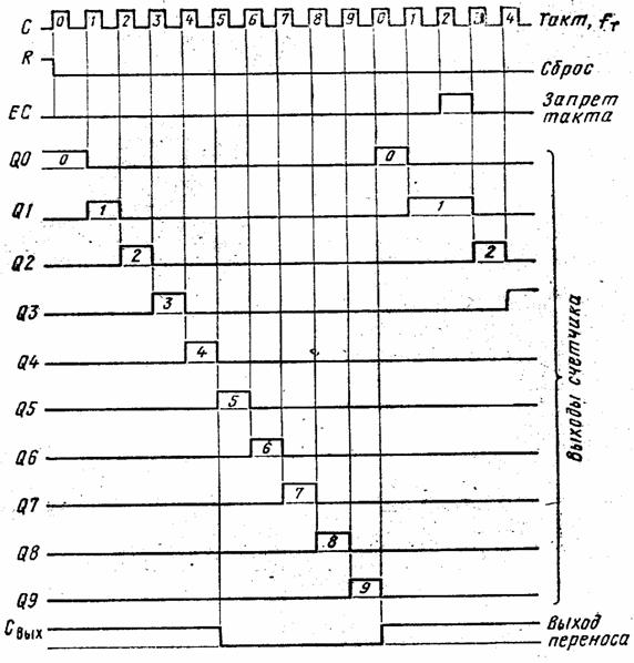 Режим работы счетчика ИЕ9 можно выбрать согласно таблице 4. На выходе ТС появится напряжение высокого уровня, если выходной код счетчика ВННВ (т. е. 9), а на входе СЕТ напряжение высокого уровня.