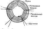 Нервная система изучается в беседе, в процессе которой целесообразно вспомнить сначала особенности строения и функциональное значение нервной системы белой планарии, а затем путем сравнения установить особенности этой системы дождевого червя (брюшная нервная цепочка, хорошо развитое окологлоточное нервное кольцо, надглоточный узел, выполняющий роль головного мозга). Далее необходимо предложить школьникам вспомнить, что лежит в основе нервной деятельности,— что такое рефлекс.
