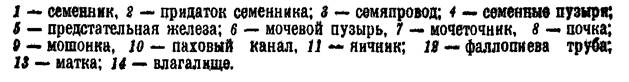 Органы воспроизведения (рис.11). Половые железы самца – семенники – имеют характерную овальную форму. У однопроходных, некоторых насекомоядных и неполнозубых, у слонов и китообразных они в течение всей жизни находятся в полости тела. У большинства других зверей семенники первоначально располагаются в полости тела, но по мере полового созревания они опускаются вниз и попадают в особый расположенный снаружи мешочек – мошонку, сообщающуюся с полостью тела паховым каналом. К семеннику прилегает вытянутое по его оси зернистое тело – придаток семенника, морфологически представляющий клубок сильно извитых семявыводящих каналов семенника и гомологичный переднему отделу туловищной почки. От придатка отходит гомологичный вольфову каналу парный семяпровод, которые впадает у корня полового члена в мочеполовой канал, образуют парные компактные тела с ребристой поверхностью – семенные пузыри. У млекопитающих они представляют железу, секрет которой принимает участие в образовании жидкой части спермы; кроме того, он обладает клейкой консистенцией и благодаря этому служит, видимо, для предотвращения вытекания спермы из половых путей самки.
