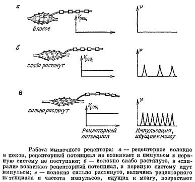 В фоторецепторах рецепторный потенциал передается дальше электротонически и влияет на количество выделяющегося медиатора. У позвоночных или усоногих раков и следующая клетка безымпульсная и только третий нейрон цепочки способен к генерации импульсов. А вот в рецепторе растяжения наших мышц ситуация совершенно иная. Этот механорецептор представляет собой окончание нервного волокна, обвивающееся спиралью вокруг мышечного волокна. При растяжении ншпцы витки спирали, образованные безмиелиновой частью волокна, отходят друг от друга и в них возникает Г-цепторный потенциал — деполяризация, обусловленная открыванием Ка-каналов, чувствительных к деформации мембраны; этот потенциал создает ток, идущий через перехват Ранвье того же волокна, и перехват генерирует импульсы. Чем сильнее растянута мышца, тем больше рецепторный потенциал и тем выше частота импульсации.