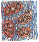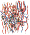 Рыхлая волокнистая соединительная ткань чрезвычайно распространена в организме. Она очень богата, наоборот, клеточными формами разных типов. Одни из них участвуют в образовании волокон ткани (фибробласты), другие, что особенно важно, обеспечивают прежде всего защитные и регулирующие процессы, в том числе через иммунные механизмы (макрофаги, лимфоциты, тканевые базофилы, плазмоциты).