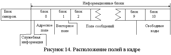 Информационные блоки содержат служебную информацию, адресное поле, задающее адреса пейджеров, которым адресованы сообщения, векторное поле, указывающее, где расположены сообщения в поле сообщений и их длина и непосредственно поле сообщений, содержащее сами сообщения. Последовательность расположения полей в кадре показана на рисунке 14.