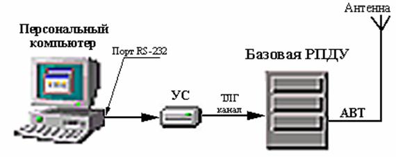 С последовательного порта снимаются двуполярные импульсы с напряжением ±12 вольт. Для создания стандартного телеграфного канала используется устройство сопряжения (ключ), которое совместно с аппаратурой организацией радиоканала преобразует импульсы с последовательного порта в формат ±60 вольт. Сигналы с устройства сопряжения (УС) подаются на базовую передающую радиостанцию (смотри рисунок 6), далее по антенно-волноводному тракту (АВТ) на антенну и в эфир.