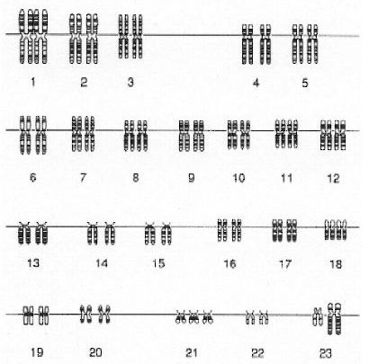 Рис. 2 Схематическое изображение кариотипа мужчины, страдающего синдромом Дауна. Нерасхождение хромосом G21 в одной из гамет привело к трисомии по этой хромосоме