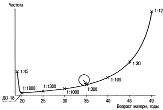 С возрастом существенно возрастает вероятность рождения детей с синдромом Дауна. Так, в возрасте 45 лет она составляет около 3%. Высокая частота детей с синдромом Дауна (около 2%) наблюдается у рано рожающих женщин (до 18 лет). Следовательно, для популяционных сравнении частоты рождения детей с синдромом Дауна надо принимать во внимание распределение рожающих женщин по возрасту (доля женщин, рожающих после 30—35 лет, среди всех рожающих). Это распределение меняется иногда в течение 2—3 лет для одного и того же населения (например, при резком изменении экономической ситуации в стране). В связи с уменьшением в 2 раза числа женщин, рожающих после 35 лет, в последние 15 лет в Белоруссии и России число детей с синдромом Дауна снизилось на 17—20%. Увеличение частоты с увеличением материнского возраста известно, но в то же время необходимо понимать, что большинство детей с синдромом Дауна рождены матерями, возраст которых младше 30 лет. Это связано с большим числом беременностей в этой возрастной группе по сравнению со старшей группой.