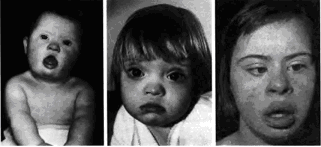 Рис. 4 Дети разного возраста с характерными чертами синдрома Дауна (брахицефалия, круглое лицо макроглоссия и открытый рот эпикант, гипертелоризм, широкая переносица, косоглазие)