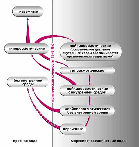 Первичные животные появились при солености выше 5-8 ‰, но ниже современной океанической. Произошедшие от них организмы без внутренней среды (нет полостных жидкостей, крови, лимфы и гемолимфы, как у современных турбеллярий) вышли в пресные воды, а также заняли морские со всем спектром солености. Они дали начало пойкилоосмотическим организмам с выраженной внутренней средой (например иглокожим, морским моллюскам, большинству ракообразных). Некоторые из этих животных, только приобретя гиперосмотическую регуляцию, смогли освоить пресные воды соленостью ниже критической (пресноводные раки, моллюски, рыбы и др.). Гиперосмотические пресноводные, сохранив характерные для них значения внутренней солености, дали начало наземным и вторично морским. Большинство вторично морских при этом стали гипоосмотическими (морские рыбы, креветки-палемониды), остальные - морскими пойкилоосмотическими, которые способны повышать тоничность внутренней среды за счет задержки в крови мочевины. Пунктиром показаны менее вероятные пути эволюции.