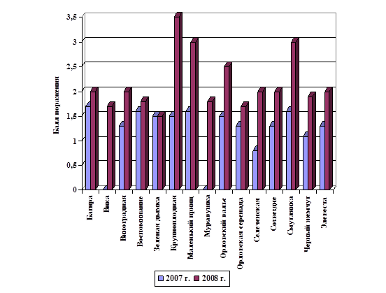 Сравнивая результаты учетов поражения мучнистой росой изучаемых сортов смородины в 2007-2008 годах, нами установлено, что в 2008 году заболевание развивалось значительно сильнее (рис. 6).