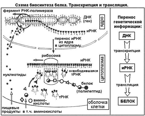 Таким образом ДНК (ген) выполняет роль матрицы (шаблона, образца) для синтеза белка. Информационная РНК служит промежуточной матрицей, то есть рабочей копией гена. В целом в молекулярной биологии выполняется принцип: один ген - один белок.