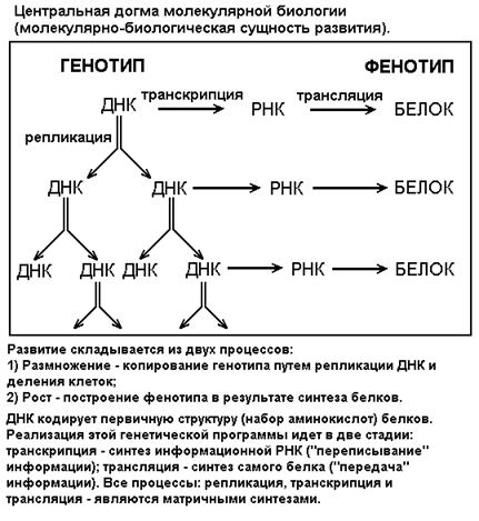 Теперь схему центральной догмы молекулярной биологии можно дополнить механизмом репликации ДНК, после чего она будет иллюстрировать всю молекулярно-биологическую сущность индивидуального развития (рис. 15).