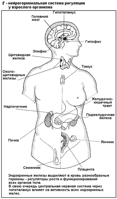 3. Нейрогормональная регуляция дефинитивного (окончательного) типа, осуществляемая сложной системой желез внутренней секреции и нервной системой (рис. 17 г). Заметим, что гормоны вырабатываются железами под контролем нервной деятельности, а нервная система в свою очередь находится под воздействием внешней среды.