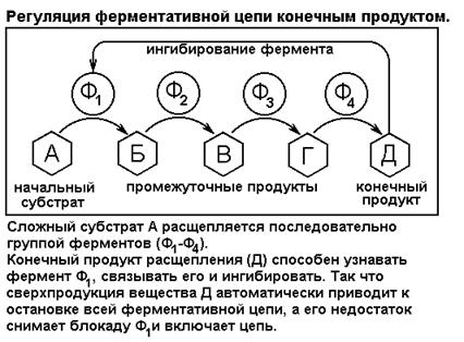Другой пример простых саморегулирующихся систем, использующих обратную отрицательную связь, представляют ферментативные цепи, ингибируемые конечным продуктом (рис. 20). Такие цепи обычно локализуются на поверхности внутриклеточных или наружных мембран и проводят комплексную переработку сложного субстрата в простой продукт. Суть регуляции состоит в том, что конечный продукт имеет стереохимическое сродство с первым ферментом. Связываясь с ферментом, продукт ингибирует (подавляет) его активность, так как полностью искажает его третичную структуру. Работает следующий регуляторный цикл. При повышении концентрации конечного продукта выше необходимого уровня его избыток ингибирует ферментную цепь (для этого достаточно остановить самый первый фермент). Ферментация прекращается, а свободный продукт расходуется на нужды клетки. Через некоторое время возникает дефицит продукта, блок с ферментов снимается, цепь активируется, и производство продукта снова растет.