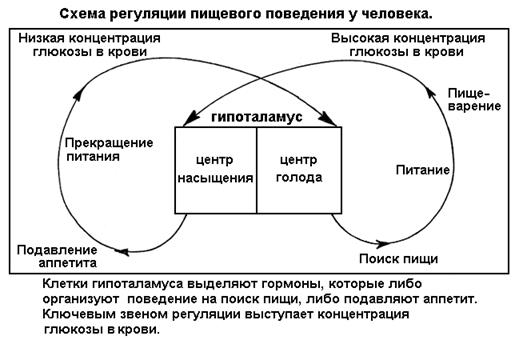 Интересна и показательна регуляция пищевого поведения у позвоночных животных и человека (рис. 21). В гипоталамусе - отделе головного мозга, ответственном за регуляцию вегетативных функций и связующем нервную и эндокринную системы (см. выше) - находятся центры голода и насыщения. В крови голодного животного (или человека) возникает недостаток глюкозы - простейшего сахара (углевода), который всасывается всеми клетками и расходуется для получения энергии (см. сегмент 13). Низкая концентрация глюкозы в крови приводит к раздражению центра голода. По нервным связям отдаются команды в мозг, на мышцы, и организуется поиск пищи. Когда пища найдена, включаются механизмы питания, пищеварения и всасывания продуктов в кровь. При этом белки перевариваются (расщепляются) до аминокислот, липиды до жирных кислот, а сложные углеводы до простых сахаров, в том числе глюкозы. Концентрация глюкозы в крови растет, что приводит к раздражению центра насыщения, далее к подавлению аппетита и прекращению питания. Когда глюкоза расходуется, ее концентрация в крови вновь понижается, отчего раздражается центр голода. Цикл повторяется. Поскольку гипоталамус связан и с нервными центрами, и со всей эндокринной системой, цикл пищевого поведения синхронизирован также с нервно-рефлекторной и гуморальной регуляцией желез пищеварительного тракта: выделяется слюна, желудочный сок, ферменты поджелудочной железы и кишечника, мобилизуется перистальтика.