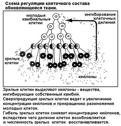 Механизм обратной отрицательной связи вовлечен в поддержание постоянства числа клеток в обновляющихся тканях, таких как кровь, кишечный или кожный эпителий (рис. 22). В этих тканях имеется резерв недифференцированных клеток (например, красный костный мозг для крови), которые многократно делятся, дифференцируются, работают, стареют и отмирают. Считают, что зрелые клетки выделяют вещества, ингибирующие молодые делящиеся клетки. Выстраивается цепь взаимозависимых реакций: при избытке зрелых клеток продукция ингибитора высока и размножение клеток подавляется; уменьшение числа зрелых клеток в результате их естественной гибели сопровождается снижением концентрации ингибитора в среде; блок клеточных делений снимается; размножение молодых клеток усиливается; число зрелых клеток восстанавливается. Далее вновь возрастает продукция ингибитора и цикл повторяется. Общее число зрелых клеток в ткани колеблется около некоторого среднего уровня, резко не снижается и не повышается. По механизму передачи сигнала здесь мы имеем гуморальную систему, ингибитор работает как внутритканевой «гормон».