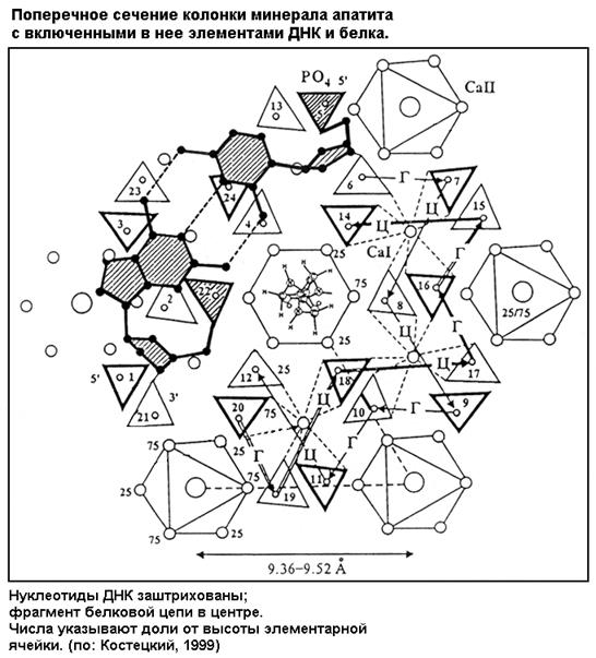 Совершенно особая ситуация возникла вокруг минерала апатита. Его большие залежи имеются в горах Хибинах, что на Кольском полуострове. Апатит добывают ради производства фосфатных удобрений, так как в его кристаллической решетке содержится много фосфора. Кроме того, кристаллический апатит присутствует в живых системах - например, в составе зубов и костей. Кристалл имеет форму бесконечно длинной колонки очень малого диаметра. Самое парадоксальное оказалось то, что периодичность повторяющихся элементарных ячеек в кристалле апатита в 3,4 ангстрема (1 ангстрем = 0,0001 мм) точно совпадает с расстоянием между последовательными парами мономеров (нуклеотидов) в молекуле ДНК, а один шаг двойной спирали ДНК соответствует циклу в 6 ячеек апатита. Атомарная структура кристаллической решетки апатита также имела сходство со структурой ДНК. На этих основаниях российским биохимиком Э. Я. Костецким в 1981 г. выдвинута гипотеза абиогенного синтеза нуклеопротеидов, то есть комплекса ДНК и белка, на матрице апатита (рис. 28).