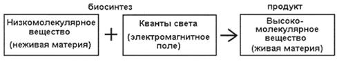 Однако живая материя, пока она действительно живая, остается неравновесной, структурированной, высоко упорядоченной. В ней имеется свободная, готовая совершить работу энергия, а энтропия минимальна. Такое состояние поддерживается за счет притока внешней энергии и ее трансформации в энергию химических связей макромолекул. Концентрация вещества и поля, то есть повышение внутренней свободной энергии материи происходит в процессе разнообразных биосинтезов (образования сложных веществ из простых), сопряженных с поглощением внешней энергии. Это и есть жизнь - противоположность смерти (правая часть схемы на рис. 4). Поскольку основной формой внешней энергии для поддержания жизни является солнечный свет, формулу жизни можно конкретизировать: