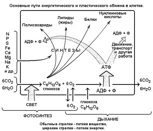 После того, как нам стала ясна роль АТФ и ее цикл, вся проблема клеточной энергетики сводится к пониманию первичных источников энергии и механизмов ее перевода в АТФ. В общем виде ситуация такова: у фотосинтетических аутотрофных организмов синтез АТФ из АДФ и фосфата генерируется солнечной энергией, у гетеротрофов - энергией от окисления пищевых продуктов (см. рис. 5). Таким образом, растениям для синтеза АТФ нужен свет, животным и человеку нужна органическая пища.
