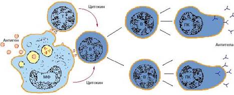 Рис. 4. Взаимодействие между фагоцитами (МФ) и лимфоцитами (Т и В) посредством цитокинов после обнаружения чужеродного агента (антиген), в результате чего плазматические клетки (ПК) продуцируют антитела.