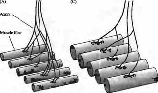 Особо яркий пример конкурентного уменьшения числа связей можно увидеть в развивающейся скелетной мышце. У взрослых животных каждый мотонейрон иннервирует группу до 300 мышечных волокон, формируя двигательную единицу , но каждое мышечное волокно иннервируется только одним аксоном. Однако в развивающейся мышце мотонейроны бурно ветвятся, так что каждое мышечное волокно в итоге иннервируется аксонами от нескольких мотонейронов (рис. 4), что называется полинейрональной иннервацией. В каждом развивающемся мышечном волокне синаптические окончания всех аксонов разбросаны вокруг одного участка, вблизи скоплений рецепторов АХ и других компонентов постсинаптического аппарата. По мере развития веточки аксонов исчезают, что приводит в конечном итоге к формированию взрослого паттерна. Этот процесс не вызывает гибель клетки (которая обычно происходит на более ранних стадиях развития), а только уменьшение количества мышечных волокон, иннервируемых каждым из мотонейронов.