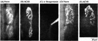 Рис. 5. Конкуренция между веточками одного мотонейрона, зависящая от активности. (А, В) Флуоресцентные микрофотографии нервно-мышечного соединения грудинососцевидной мышцы мыши, показывающие пресинаптическую терминаль (А), окрашенную при помощи 4-Di-2-Asp (который окрашивает митохондрии) и постсинаптическую мембрану (В), окрашенную при помощи родамин-связанного бунгаротоксина в низкой дозе (который окрашивает рецепторы АХ). (С) Рецепторы АХ в нижней части соединения блокированы при помощи насыщающей дозы немеченного -бунгаротоксина, что приводит к блокаде нервно-мышечной передачи селективно в этой области синапса. (D, Е) Через 31 день тот же самый синапс, что показан на А и В, был заново исследован. Терминаль аксона (D) и постсинаптические рецепторы (Е) исчезли из блокированной области. Таким образом локальная блокада передачи приводит к локальному исчезновению синапса.