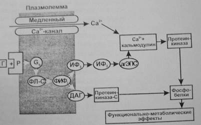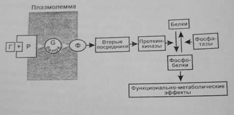 Большинство гормонов после присоединения к рецепторам активируют регулируемый гуанилнуклеотидами G-белок мембраны. Активация состоит в обмене ГДФ на ГТФ в α-субъединице G-белка. При этом происходит его распад на α-субъединицу и βγ-димер, имеющие самостоятельные регуляторные эффекты. Более изучено действие α-субъединицы, являющейся ферментом ГТФазой. Гидролиз ГТФ до ГДФ освобождает энергию, используемую для передачи регуляторного сигнала. ГДФ-α-субъединица соединяется с βγ-димером, вновь образуя ГДФ—G-белок. Имеется несколько видов G-белков (GS, Gi ,Gq ,GO), которые влияют на ферменты (например, аденилатциклазу, фосфолипазу С), образующие различные вторые посредники (например, цАМФ, инозитолтрифосфат, диацилглицерол). При этом G-белки могут как активировать (GS), так и ингибировать (Gi) образование вторых посредников. Вторые посредники, в свою очередь, активируют соответствующие им протеинкиназы, фосфорилирующие различные клеточные белки по остаткам серина и треонина, что изменяет их функциональную активность (чаще увеличивает). Наряду с этим активированные G-белки оказывают выраженное влияние на проницаемость кальциевых и калиевых каналов мембраны.