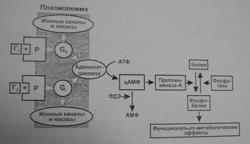 Аденилатциклазная система. Эту систему используют гормоны, осуществляющие свой эффект через аденилатциклазу и синтез второго посредника—циклического АМФ (3,5-цАМФ). Действие гормона может, как активировать, так и тормозить его образование.