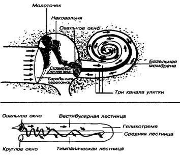 Внизу - схема каналов улитки в развернутом виде и движения звуковой волны: