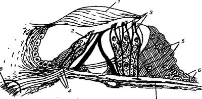 Кортиев орган: 1 - мембрана тектория; 2 - внутренние чувствительные клетки; 3 - наружные чувствительные клетки; 4 - нервные волокна; 5 - клетки Хенсена; 6 - клетки Клаудиса; 7 - базальная мембрана; 8 - спиральный ганглий