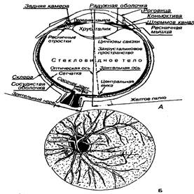 Схема строения глазного яблока (А) и глазное дно в области слепого пятна (Б).