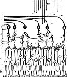 Строение сетчатки глаза. Вверху - падающий свет; 1 - волокна зрительного нерва; 2 - ганглиоэные клетки; 3 - внутренний синаптический слой; 4 - амакриновые клетки; 5 - биполярные клетки; 6 - горизонтальные клетки; 7 - наружный синаптический слой, 8 - ядра рецепторов; 9 - рецепторы; 10 - пигментный слой эпителиальных клеток