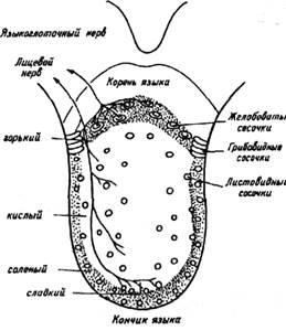 Вкусовые рецепторы заложены в сосочках языка. Они представляют собой вкусовые "почки". Чувствительные клетки в них окружены опорными и погружены в глубину. Небольшие углубления над ними заполнены слизью, в которую выстоят чувствительные волоски. Они воспринимают раздражение от веществ, имеющих к ним стереохимическое сродство. Нервные волокна, отходящие от почек, формируют вкусовые. Импульсы поступают в ядра одиночного пучка продолговатого мозга, отсюда нейроны передают импульсы в составе медиальной петли в ядра таламуса. Нейроны, заложенные здесь, передают импульсы в кору. Различают вкусовые ощущения следующих типов: сладкий, кислый, соленый, горький.