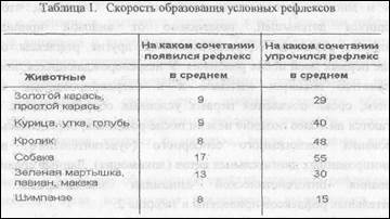 Сравнительные исследования скорости выработки элементарных условных рефлексов у различных животных при соблюдении описанных выше подходов позволили получить неожиданные на первый взгляд результаты.