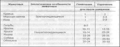 Рассмотрим вопрос о том, как рано в онтогенезе появляются условные рефлексы у различных представителей позвоночных. Оказалось, что способность к образованию элементарных условных оборонительных рефлексов на ранних этапах индивидуального развития не зависит от уровня филогенетического развития, а определяется биологическими особенностями животных. Так, есть зрелорождающиеся и незрелорождающиеся организмы. Зрелорождающиеся отличаются от незрелорождающихся тем, что у них сразу после рождения начинают функционировать органы чувств и мышечная система, то есть они способны воспринимать внешние стимулы и способны к передвижению. К таким животным относятся цыплята, козлята, утята, детеныши морской свинки. К незрелорождающимся можно отнести птенцов голубей и многих других птиц, котят, щенков. Оказалось, что у зрело рождающихся детенышей, независимо от видовой принадлежности, элементарные условные оборонительные и другие рефлексы образуются в течение первых дней после рождения. У незрелорождающихся, неспособных к восприятию внешних сигналов и к координированным мышечным движениям, сроки появления первых условных оборонительных рефлексов отодвигаются на более поздние недели после рождения, определяясь временем формирования полноценного сенсорного (чувствительного) восприятия и координированных двигательных актов (локомоция). Данные сравнительною исследования онтогенетической динамики элементарных условных оборонительных рефлексов приведены в таблице 2.