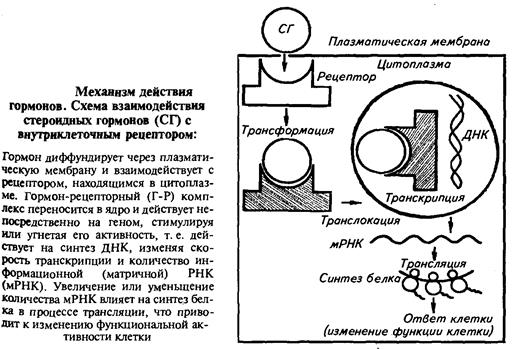 Стероидные гормоны взаимодействуют с рецепторами, находящимися в цитоплазме. Образовавшийся гормон-рецепторный комплекс переносится в ядро и действует непосредственно на геном, стимулируя или угнетая его активность, т.е. влияет на синтез ДНК, изменяя скорость транскрипции и количество информационной РНК. Увеличение или уменьшение количества мРНК влияет на синтез белка в процессе трансляции, что приводит к изменению функциональной активности клетки.