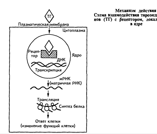 Тиреоидные гормоны из цитоплазмы проникают в ядро клетки, где взаимодействуют с рецепторами, образуя активный гормон-рецепторный комплекс. Он действует непосредственно на геном, стимулируя или угнетая его активность, изменяя скорость транскрипции и количество мРНК. Увеличение или уменьшение количества мРНК влияет на синтез белка в процессе трансляции и приводит к изменению функциональной активности клетки.
