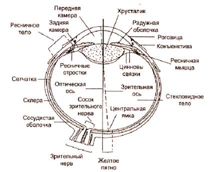 Место выхода зрительного нерва из сетчатки не содержит фоторецепторов и называется слепым пятном. Латерально от слепого пятна в области центральной ямки лежит участок наилучшего видения - желтое пятно, содержащее преимущественно колбочки. К периферии сетчатки число колбочек уменьшается, а число палочек возрастает, и периферия сетчатки содержит одни лишь палочки.
