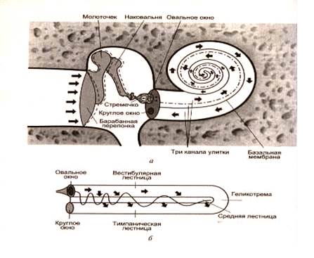 Восприятие высоты, силы звука и локализации источника звука начинается с попадания звуковых волн в наружное ухо, где они приводят в движение барабанную перепонку. Колебания барабанной перепонки через систему слуховых косточек среднего уха передаются на мембрану овального окна, что вызывает колебание перилимфы вестибулярной (верхней) лестницы. Эти колебания через геликотрему передаются перилимфе барабанной (нижней) лестницы и доходят до круглого окна, смещая его мембрану по направлению к полости среднего уха.