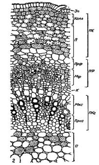 Рис. 2. Поперечный разрез молодого стебля липы: К-камбий; Колл-колленхима; Мкс- метаксилема; Мф-метафлоэма; П-паренхима; ПК- первичная кора; ПКс-первичная ксилема; Пркс- протоксилема; Прф- протофлоэма; ПФ-первичная флоэма; С- сердцевина; Эп- эпидерма. (Крамер, Козловский, 1983)