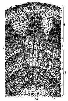 В результате деятельности первичных меристем складывается первичная структура стебля. Если камбий работает слабо или совсем отсутствует, то она может сохраняться длительное время. Если камбий энергично откладывает вторичные проводящие ткани, то первичное строение быстро сменяется вторичным. Границу между ними иногда провести трудно, так как клетки камбия начинают делиться еще до окончательного формирования первичных тканей.